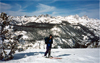 It calls for being climbed, so why not on skis in winter? Except this winter every weekend seems to be stormed out. The scheduled SMS trip for the weekend was of course canceled. One storm ended on Friday, the next bigger one was forecast for Sat night. Well, one has to take chances in ski mountaineering. An old SMS tradition is to borrow a friend's mountaineering wife (or husband) and head for the mountains on a short notice. Susan Livingston badly "needed" San Joaquin Mtn and I agreed that we should give it a try. Left Fri after work, crashed in Bishop, got up Sat at 5:30 am, and started to ski at Mammoth Mtn before the resort crowds arrived.
