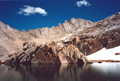 Wed, July 10 - We headed over a pass north of Gemini and dropped down some ledges to the Seven Gables Lakes. The gullies on the pass had snow in them so we downclimbed on dry ledges most of the way. We saw trout in Seven Gables Lakes but kept walking toward Vee Lake.