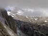 The XC hike starts in desert brush (8,400'), follows a dry streambed, steepens and runs into decomposed granite slopes which give way to a gentle sandy summit plateau. The summit block at 11,630' is an easy cl3 scramble. During the two-hour climb dark clouds had moved in and now covered all the high peaks. Occasionally a glimpse of the Palisade Range poked through the clouds which were rapidly sinking down. A cold wind was blowing and much of the summit area was covered with fresh snow.