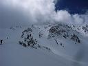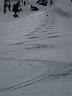 Via walkie-talkie, we agreed to re-group above the cornice. From there, the challenge was to find our way off the edge. Dan inadvertently lead the way by sliding off the edge that none of us could see. Cedric managed a decent entry while I fell through the curl of the cornice that I couldn’t see. Brad and Scott both found sweet spots to enter through.