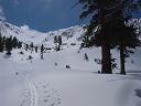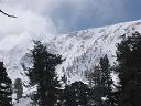 San Gorgonio: At 7:00 a.m. Scott, Cedric, Brad, Dan and Bob met me at the South fork parking lot, where I had spent the night. The snow base from the previous weekend plus the new snow from the latest storm made it possible to start skiing right across Jenks Lake Road from the parking area. The initial ascent up to the lower end of the major avy paths that come down from Mt. Charleton was smooth and easy including the route that goes up through the trees directly to the lower end of Big Draw. At that point, the upper slopes of the east facing chutes of Mt. Jepson were beginning to show through the windows between the Lodge Pole and White Pines.