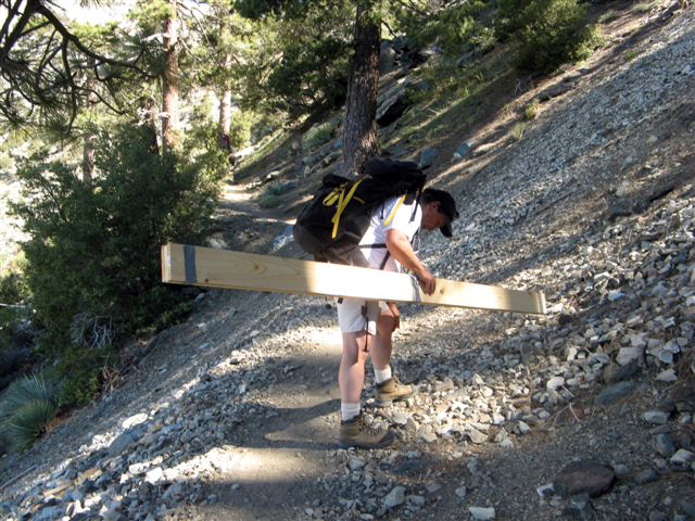 SMSrs Mark Goebel and Ken Deemer carrying beams to Baldy Hut. Photo by Bahram Manahedgi. Back to trip report