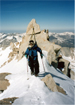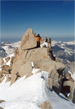 Luckily I did not break through where the depth of the holes exceeded the length of the ski poles. After reaching the ridge it was a short traverse to the summit block. A cl 3 move got us to the peak register located in a crack of the summit boulder at 13,577'. It was a pleasure to sign in as the first party in 2002. We enjoyed the wonderful summit views in the morning sun.