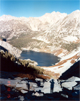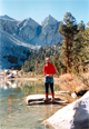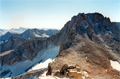 On Sunday, 10/15/88, we were up and out at first daylight, heading up the Ouzel Creek drainage toward Mt Brewer. It was clear and chilly but in the distance the first sunlight was already on the Brewer-North Guard ridge. The eastern face of Brewer above the glacier looked quite impressive. We ascended the northeast ridge without difficulties. It was mostly class 2-3 climbing but a 4,000' ascent. At 9:30am we summitted and signed the peak register. The mood was great and so were the views from this high peak.