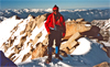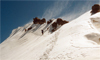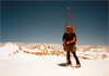 Some of us wanted to climb State Pk (12,620') and the nearby northeast ridge looked doable. I argued for a quick ascent before the clouds would move in. By 1:30pm R.J., Susan and I started our ascent. We left our packs and skis at the 12,000' saddle 0.2mi NE of the peak. From there we cramponed up the corniced NE ridge reaching the summit at 3pm. After digging 10min in the snow near the highest point we found the peak register and signed in.
