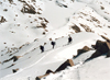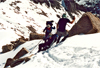 Two different routes created confusion in our rear party. The ski route was too advanced, the climb on foot was too arduous since one sinks in to the hips at each step. While Duncan reached the pass, I struggled along a 40deg ledge and the rest were calling for help at the bottom. Duncan struggled back down the pass. When I arrived at the top the weather had deteriorated into blizzard conditions. There was no way to ski down without visibility. So I got the shovel out, dug a pit into the snow and set up my tent to get out of the wind to avoid getting hypothermia. Now I regretted that we did not bring our radios for communication. My assumption was that we would wait till the storm would settle and then the group would follow. The storm decayed after a few hours but nobody was in sight. Then Duncan called and reported that the group had found a different pass 0.3mi to the east which they could tackle with skis. By 4pm we regrouped and skied/hiked together down to Lke 11,000' where by 5pm we made camp for the night (11 362393E, 4087573N). More snow fell in the night.