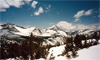 Goat Crest Pass (11 358600E, 4083400N, 11,500') was slightly higher but there was a 900' drop down to the lakes. Three skiers contoured around the bowl, two hikers dropped down and climbed it out. The snow had become very soft and trailbreaking became a real workout. It was not the ideal time to cross wet slopes when balls began to roll and grow to 3' diam. By 3pm we made it safely into the pass. The views to either side were wonderful: To the east the entire Palisades Range came into view, to the west huge cumulus clouds grew over the Monarch Divide. Susan was overwhelmed by joy and tears, the less emotional crew just captured the moment in pictures. The roller coaster continued with a fabulous ski run down into a small lakes basin 0.4 mi west of Munger Pk.