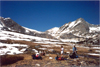 The return on foot went well, but descending the North Couloir posed some surprises: Tetsuo did a high-speed (i.e. uncontrolled) glissade and barely missed a rock outcropping. Most everyone plunge stepped down the couloir and I did mostly kick turns on my 210cm Tua Toute Neiges. Guerman, a sporty young man from Russia, had ascended Conness with great ease but when it came to downhill skiing he became very frustrated with our "toothpick" telemark skis. After many falls he finally joined the hikers. Upon returning to basecamp we relaxed, prepared our dinners and later watched a full moon rise.