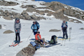 When the designated turn-around time of 1:30pm came up we took a short break, peeled off the skins and headed back. It was fun cruising down on soft spring snow. Energetic Helga and Terry skated over the lakes, the rest of us followed at a slower pace. Below Evolution Lake we climbed up the slopes to reach the lower Darwin Bench from where we skinned up to our tents. We rejoined with Don who had turned around earlier to explore the pretty Darwin Bench.