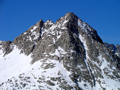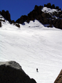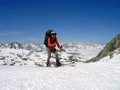 We started to skin up. When the switchbacking on steep hard snow got too difficult we packed up the skis and started a long ascent. As we got higher the wind became more amd more ferocious. It came in gusts where you had to hold on not to get out of balance. Near the col it may have been over 50 miles per hour since one could be blown over without firm support. Just east of the col there was a calm due to the wind eddy. Further below the wind came down again in full force. There was no chance to climb Mt Lamarck since we might be blown off the summit.