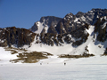 On Monday, 4/28, we were having a lay-over day. We had two choices, to ski the Darwin Glacier or to tour the Evolution Valley. Due to the binding trouble we chose the latter. From the Darwin Bench we dropped down into Evolution Valley in the direction of The Hermit. It involved a steep climb down on rocks, grass and through trees, then a short acent to Evolution Lake.