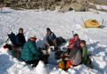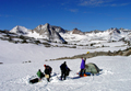 There was a splendid view from the pass over peaks and valleys. To the south one could see our destination, the Evolutionists Darwin and Mendel. To the north was Humphreys Basin and many snow-covered peaks on the horizon. Unfortunately, the south side of Alpine Col had no continuous snow coverage. There were two rock bands which we had to climb over before we could ski. But from then on the fun started. We skied down to Lake 11,910 leaving nice tracks behind. We headed further south to Lake 11,540 and crossed to its south end. Now it became time to look for a campsite. Helga and Terry explored one area, Jim another one and the rest had a break. Finally, we decided to continue on to the Darwin Bench. We found a fine area with a running stream and a great view over the Evolution Valley. Unfortunately, Helga's binding developed a problem and she had to ski very carefully from now on. Cirrus clouds were moving through, indicating a possible weather change. Bahram built a snow kitchen where we gathered for happy hour and dinner. Bahram cooked Persian specialties and we had a lively discussion about male vs female cooking skills. There was less controversy about who provided the best spirits, Don's Bourbon was as popular as Fred's Tequila. We had a happy time till it got dark and when some wind came up we retired in our tents.