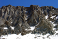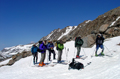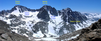 From Piute Pass we headed west toward Muriel Lake (11,336'). The lake was frozen solid and there was no worry to break through the ice. From the south end we ascended to the next lakes, Goethe Lake (11,531'). This is the fun of spring skiing compared to summer hiking: You ski straight across the lake rather than boulder-hop around the shores. From Goethe Lake one has a clear view of Alpine Col, which looks a bit intimidating from a distance. One could diagonal up from the left or right side but both routes included rock bands. The straight-on ascent had continuous snow but looked steep. We chose it since the snow seemed soft enough by noon. We started our 1000' ascent by switch-backing up on skis. As we ascended the soft spring snow had intermittent stretches of hard, windpacked slabs. The slope steepened and kick-turns became dicey. Six out of seven booted up the hill with heavy packs and skis on the back. A slip was not an option on this slope. We all made it safely to the top of Alpine Col.