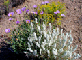 Near the northern outlet of Grass Lake we found a trail and followed it on intermittent snow down to the North Lake Road. Another walk down the road brought us back to the cars -- and the cold wind, now blowing down the valley from Lake Sabrina. We drove to Bishop and rejoined for lunch at Schatzi's, then headed back on our long drives home. There were lots of pretty wildflowers on the sides of Hwy 395.