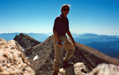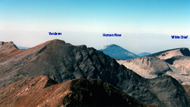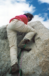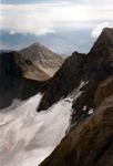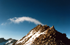 It is an old mountaineers rule to start climbing early in the morning. By first daylight I was heading toward Thunderbolt Pass. The ascent is south of the pass through steep chutes to the crest. The crux was a cl 4 ledge and chimneying a crack ending up at the top of the U-notch which comes up from the east side. Everything went well and after a 4 hour climb I was on the summit (14,242').