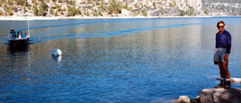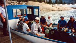 I found many pictures of former peak climbing trips which may be entertaining or even useful for others planning similar hikes. Otherwise they would fade into oblivion. Most of them are from former listed or private peak climbs throughout the Sierra Nevada. I have ordered them roughly by regions but do not claim completeness or all SPS peaks, just showing some selected cases. Short trip descriptions are added from memory or other write-ups. All old pictures are scanned photographs, hence do not have the same quality as the present digital pictures. Goddard and Emerald This was an SPS trip on Aug 10-13, 1996. Henry Arnebold and Ali Aminian lead a group of four participants to two fine Sierra peaks, emblem peak Goddard and Mt Emerald. The trip started with fun, a boat ride across Florence Lake, which shortens the access to the John Muir Trail. I did a short stopover at the Muir Trail Ranch to deposit a resupply package for my upcoming JMT hike. Then we proceeded toward Goddard making camp before reaching Marie Lake. The next day we climbed Mt Goddard. There were still significant snow fields on the way, mostly sun cupped. It was enjoyable on the summit. Sunshine, no winds, fine views, we had lunch and took many pictures. We returned the same way, packed our tents and hiked down Goddard Canyon along the San Joaquin River. We ascended Emerald from the southwest. It is a regular cl 2-3 peak but has a fine view to the east. On can see the Evolution Range, The Hermit, McGee, etc. On the last day we hiked out to Florence Lake where we got again a boat ride across Florence Lake to the cars. It was a successful and pleasant trip in good company. |