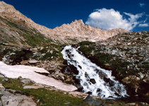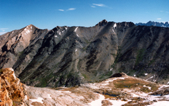 The northern and eastern slopes had large snow fields, but the peaks could be ascended on rock. On the lower western slopes the wildflowers were in full bloom and a variety of wildlife was visible. Climbing and hiking were really enjoyable.