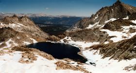 Lippincott and Eagle Scout were done on another solo trip on a long weekend in early summer, June 22-24, 1996. There was plenty of snow everywhere, thus it was a mixed rock and snow climb. I ascended to Glacier Pass, dropped down to Spring Lake and climbed up Blackrock Pass to camp at the Little Five Lakes, a good workout for one day. Maps of the area can be found from earlier climbs of the Kaweahs or later climbs of Picket Guard.