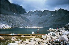 This was a peak climbing adventure while guiding a group of Boy Scouts across the Sierra Nevada. The trip started on Aug 23 at South Lake, went over Bishop Pass, down to LeConte Cyn, west along the Kings River to Simpson Mdws, up to Granite Pass and down Copper Cyn to Cedar Grove, a 50 mi 8-day trip. There were 5 boys and two adult leaders. The boys had two layover days, which I used for peak climbing. The first was in Dusy Basin where the troop camped at Lake 11,393' just west of Mt Winchell. I attempted to climb North Palisade from the west, where Secor's guidebook describes a cl 3-4 route. The only unknown was the weather since it rained on and off and the summits were in clouds in the afternoon.