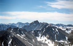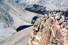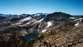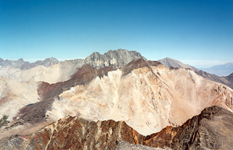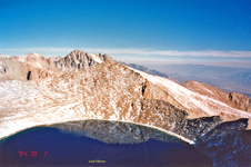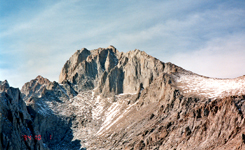 Many of us have seen Bloody Mountain when driving on Hwy 395 south from Mammoth Mtn. In winter it looks very impressive and challenges the skiers to do the Bloody Couloir. But in summer it makes an easier and rewarding day hike. This is what I did on July 27, 1997. I started from Convict Lake, hiked to beautiful Lake Genevieve and climbed the scree slopes to the summit. I looked down the Bloody Couloir chute which still had some snow left. The upper part is STEEP. The views from the summit were great. Nearby Red Slate with its skiable North Couloir was clearly visible. Puffy summer clouds were abundant but no thunderstorms had started yet.
