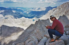 The next day I headed up to the Russell-Carillon Pass to climb both peaks. The east ridge of Russell looked a bit intimidating, especially with some snow coverage. But after a deep breath I started the climb. Getting over the false east summit was exciting, as was the long traverse to the higher west summit (14,086'). A slip on the ridge was not an option, so I climbed carefully taking my time. Another climber joined the fun and we both made the summit.