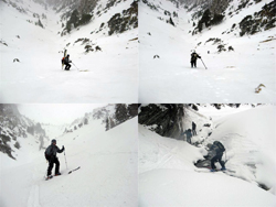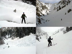 The skiing back down to the jump off was not the fun we were hoping for as it was icy and hard packed with a bit of powder in one aspect. At the jump off, the clouds had gotten to us and we had a bit of new snow with a lot of wind. Crampons and ice axes were an absolute must to get part way down the headwall to a point where the snow was soft enough to hold a ski edge. We did have a very good time skiing from here in the grapel down to where Jake was able to get some movies of us. At that point, we helped Jake pack his movie making equipment and together we skied the next couple of miles on the gently sloping terrain all the way back to our cars.