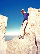 ledges. We found the cl. 4 summit block which is reached after a four foot "airy traverse" ( RB I remember it as a three foot step across from a flat shelf with one handhold to a slope. It slopes toward you as you are standing on the flat shelf.) with seven to ten feet of exposure on the left and perhaps 100 feet on the right. The third move after the step across is an easy layback using a crack and then two moves farther is a fixed pin to clip in.