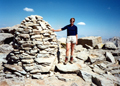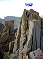 THURSDAY: At 5:50am we headed up Milestone Creek toward Table Mtn. We climbed to an unnamed Lake 11,900' East of Midway, South of Table, then ascended the Southeast scree slopes of table aiming at a V-notch in the skyline. The brown ledge in the middle of the Southern escarpment leading diagonally up toward the upper right as described by Roper (Route #3) is clearly visible. The goal is to get to its lower left (SE) end that is not straightforward. A duck-marked ledge leads initially away (SW) from the ledge, then works upward, turns back and down toward the start of the brown ledge. Following the ledge leads to an arete where one turns left and up a chute with lots of loose rocks. En route there is a key hole to crawl through. Then it is easy scrambling to the flat summit plateau.