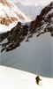 Snow Conditions: Anything from black ice to water. At high elevations powder, crust, glacial ice but also superb hard-packed snow for paralleling, further below often breakable crust, wet and grabbing cement, and at low elevations very wet bottomless slush in which even my fat skis vanished when skied unevenly. By mid morning on a sunny day, there can be wonderful corn snow. However, traversing large avalanche fields early in the morning is a random walk through ice blocks. Descending in a steep creekbeds involves sideslipping over willows, rocks, grass and cowpies.