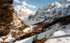 We all made our own flight arrangements. I left Los Angeles on Sat 4/24 to arrive in Zuerich on a grey, rainy Sun morning. Upon earlier arrangement, I was picked up by my brother Juergen who lives in Augsburg/Germany and wanted to ski with me for a weekend in Zermatt. We drove in his VW bus from Zuerich-Kloten to Luzern (Vierwaldstaetter See) where high mountains began to poke out of the clouds. The shortest route went via Andermatt (St Gotthard tunnel) over the Furka Pass, but the latter was still closed due to the heavy snowfall and we had to take a car-train to the upper Rhone valley. There it became sunny and warm and it was a pleasure to drive South of the Berner Oberland below Finsteraarhorn and Aletschorn to Brig and Visp. We saw much damage from previous avalanches which ran down every canyon from the Aletschgletscher. Then one turns into the side valley of the Matter where the road ends at Taesch and one takes a tram to Zermatt. While walking through the town to find our Pension Burgener we ran into Don Pies who had arrived a few hours earlier. We later explored the town together, searched in vain for the Matterhorn in the clouds, then ate dinner at Burgeners, and went to bed early.