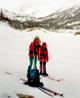 The ascent takes about half a day. Starting in the morning this would get us at lunch time to the col and when the snow has softened up between 12-1 we would be ready to ski down. So goes the theory. As we ascended the clouds moved in. As we reached the summit we were in a whiteout. No chance to bag nearby Mt Lamarck. We only got an occasional glimse of the impressive ridge of the Evolution peaks (Darwin, Mendel, etc). The expected corn snow did not materialize and we cruised down on hard packed snow on the top, breakable crust further down and eventually some soft snow.