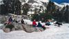 Mark had been to the jump-turn clinics, so we all pretty much watched him do some nice jump teles. The dog was right behind Reiner coming down, and he really seemed at home in the snow already. Since we were burning daylight, we went back toward camp and climbed the hill overlooking our bench, After a couple of attempts to find a good route to the snow field above our camp, we found a way thru the rocks and bushes to some excellent snow, and the group skiied down, meeting Ray Smith on his way back up. He had elected to pass on the trip to Dade lake, and had skied the slopes around camp and the gulley toward Long Lake. We all skied down to the Treasure Lakes basin again, and then climbed back up to camp. |