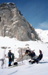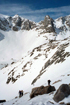 With the assurance of good TG snow, we ascended some steep slopes leading to the base of Mt Mary Austin (3978m). However, at 11am it was too late for a peak ascent. So we lunched on the rocks, enjoyed the view of Dragon Pk and similar "aiguilles", and finally got ready for the ski run down to camp. The snow was just right for carving. The run down to the Parker Lks was exciting. The randonnée skiers (Angel, Coby, Maciek) enjoyed it so much that they did it twice. Further below, the firm base gave way to soft, grabbing snow which required careful balance on telemark turns.