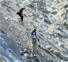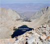 After taking pictures of this historic register, enjoying the views of nearby McAdie, Muir, Whitney, Russell, etc., it was time to descend. At 1:30pm we were back at Whitney Pass. The sandy chute leads straight down to Consultation Lake (11,680'). Usually scree slopes are fun to descend. So we decided to jump into it, two in parallel since the rocks were tumbling down the chute. After a while we would duck for shelter and radio the other pair to come down. It was fun until the sand gave away to hard clay and the footing became insecure as the angle steepened to >35 deg and the chute funneled down into a narrow gully. We had to get out of the chute. We traversed just below the rockwall to a second broader gully, which also lead down to the lake.