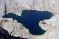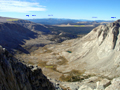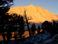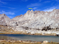 I had scheduled this trip for the last two years (see Archives) but it never materialized. Since the peaks are not on the SPS List, few peak baggers are interested in climbing them. But especially The Miter is a real climbing gem. A short trip report was found on climber.org, but none in the SPS archives. The peaks are located in the southern Whitney group, more precisely south of McAide in Miter Basin or the Rock Creek drainage (not Little Lakes Valley). It takes a day to get in and out, so I made it a 4-day trip. On Tue, Sep 11, I drove from L.A. to Lone Pine, got a wilderness permit and hiked in to the Cottonwood Lakes, camping at the long Lake #4. It was warm, a moonless night with a spectacular star display at 11,000'. No bears, no mosquitoes, few people. On Wed, Sep 12, the summer seemed to come to an end with high winds preceeding a cold front. I climbed over old Army Pass (11,972') to be nearly blown over. My destination was Sky-Blue Lake in upper Miter Basin. Since it is not far, I decided to climb The Major General on the way. The Major General is a named peak which must have been a mistake by the USGS. Although it looks like a nice summit from Miter Basin it really is only a high point (12,316') on a long ridge coming down from Mt Langley. It is often climbed on the way back from Langley. From other directions one has to endure an ascent over loose scree slopes, no fun with a full pack, as I can attest. Coming from Army Pass I went north on the trail to the Soldier Lakes, then ascended XC the west ridge from Langley and soon reached the cl3 summit block of The Major General. There was a 20-year old peak register. I found only two names of familiar SPS members (Secor, Oliver). R.J. describes the peak as not worthy the climb, but the views were nice: The Soldier Lakes are pretty, the view up Miter Basin is splendid with the scenery of familiar peaks, such as Pickering and Joe Devel, which we once skied. It was nice to see in a different season peaks like The Miter, McAdie and the Irvine-Corcoran Ridge. I descended from this minor peak climb into Miter Basin and headed up Rock Creek. This is a pretty valley with open meadows, some lakes and stands of foxtail pines. Ten years ago we skied along this valley on a traverse of Mt Whitney. I took a break at a small unnamed lake south of The Miter but it was too windy and cool for a swim. In the late afternoon I headed up to Sky-Blue Lake where I set up camp. From the summit of The Major General, The Miter looks like a rather small peak, maybe like Fin Dome near the Rae Lakes. But that changes as you approach it. Near Sky-Blue Lake The Miter is an impressive peak with two summits and steep walls for technical climbers. Yet there is a nice class 3 route on the north side. From the north the peak actually resembles a mitre hat. It was a cold and windy night at Sky-Blue Lake (11,552'). Cirrus clouds indicated an incoming front. But next morning it was still clear. On Thur, Sep 13, I got up at 6:30am and started to hike an hour later. One ascends an obvious chute from the lake to a plateau at the base of the mountain. Then one climbs on loose scree to the north side of the North peak. |