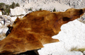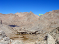 The keyhole is a narrow north-south passage between vertical blocks on the right summit ridge. The wind funneled through the hole like in a wind tunnel. After some failed attempts I got through between the gusts. On the south side of the ridge the fun continued, but luckily with warm sunshine and less wind. It required some route finding skills and high class 3 moves to reach the summit block. It was 8:45am when I reached the summit (12,797'). A very recent Miter trip report mentioned the disappointment of finding no summit register. Thus, I brought one along and placed it in a cairn on the summit. I enjoyed the summit views of many familiar peaks, passes and lakes. Particularly impressive was green-blue Iridescent Lake in the morning sun. The jagged ridge line from Irvine, Mallory, LeConte and Corcoran was also amazing. To the south one could see across the Southern Sierras and the foggy San Joaquin Valley to the San Rafael Mountains, at least a 100 mi visibility. After a snack and lots of picture taking it was time to descend. I had left a few cairns on my way up which were helpful for retracing the route. On the other hand, there is not one but many ways to traverse on the ledges in the north chute. It was a fun climb and by 10:30am I was back at camp. By 11:00 I left pretty Sky-Blue Lake while another group was heading up. My destination was to camp at the Soldier Lakes. The lower one is usually very popular, but when I arrived I had it to myself and stayed, especially since it was wind sheltered in a valley with trees. Part of the lake was turning into a meadow in this low-rain year. Ducks were swimming along the marshy shore and trout were jumping at sunset. Too bad I had no fishing gear for the big goldens in the lake. On Fri, 9/14, I climbed to the upper Soldier Lake which has some pretty stands of foxtail pines, then continued up the trail to Army Pass. On the way I saw an interesting formation of needle ice produced by subfreezing temperatures at night. On the open plateau above the pass the wind was howling again. Army Pass is straightforward in summer but in the snow season the descent may be a challenge. I followed the trail along the Cottonwood Lakes and saw some pretty deer in the meadows. Lateron some guys in camouflage and red hats came up. Nature's cycle continues. In the evening I drove to Onion Valley to join Randall Danta's SPS List finish climb of Independence Pk on Sat, but that's another story. |