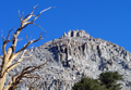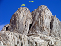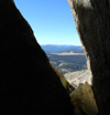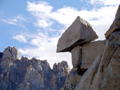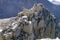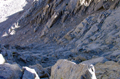 There you see a rock outcropping with a huge chockstone. Pass in front (west) of this "bridge rock" and you enter the north chute of The Miter. It is a wide chute which ends in a steep wall below the summit ridge. There are two landmarks visible: A large block on the left summit ridge which seems to fall down any moment. This teeter-totter boulder is to the left of the summit area. On the right side of the ridge there are also huge rocks which provide a keyhole to ascend the ridge. Anything else is class 4. One ascends on various ledges traversing between the middle and the right side of the chute. It is fun class 3 climbing. It was cold and windy in the north facing chute. I would not attempt it when covered with snow.
