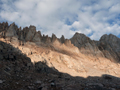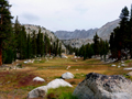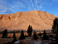 I am writing this report in November. The summer is long gone in the high country of the Sierra Nevada but I have such nice memories of a trip in mid August that I would like to share some pictures in this short trip report. In 2007 I climbed The Miter and looked down on Iridescent Lake. It was so beautiful that I always wanted to come back and stay at it for a while. After five years it finally happened. On Thurs, Aug 16, I drove to Lone Pine, got a wilderness permit for Miter Basin via Cottonwood Lakes trail and took off. The Ranger mentioned that Miter Basin is a mountain lion territory. While I was accustomed to bears this could be a new adventure. In the late afternoon I made camp at Cottonwood Lake #4. The Cottonwood Lakes have pretty big golden trout, but only for catch and release. It was a pleasant stay. No moon at night but a sky full of stars, and once in a while a shooting star. Fri morning high clouds moved in from a tropical storm in Mexico. I headed around Cottonwood Lake #5 and ascended Army Pass. Although it was mostly overcast there was a moment of sunlight on the Kaweahs as I descended toward Rock Creek. The entrance of the Rock Creek drainage is very pretty. I contoured around the Lower Soldier Lake and ascended above Rock Creek toward The Miter. Before ascending to Sky-Blue Lake one turns east into the Miter Basin. Although it is a cross-country hike it is easy to find Iridescent Lake (3629m). |