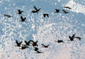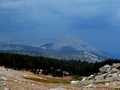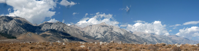 Initially, I was a bit disappointed because the lake was as grey as the sky and the mountains and it was almost raining. But that would change the next day when the morning sun came out. There was nobody at the lake and no big cat in sight. The next morning was a repeat of previous day's weather. Initially sunny, then high clouds moved in and thickened. During the sunny hour the scenery became spectacular. The mountains reflected in the green-blue water. The Miter was a huge wall of bright granite. I hiked around the lake and dipped into its ice cold water. There were red brine shrimps in the lake but no sign of trout. By 9 am the sky was cloudy again. So I decided to hike down and stay at some lower lake. By midday I was at a pretty meadow with an unnamed lake near the trail leading to Mt Guyot. While I was looking for a suitable campsite it started to thunder in the west. I was not in the mood to sit out the impending storm and decided to head over New Army Pass to the east side of the crest. I walked resonably fast but the sky got darker and darker. At the Pass the first raindrops fell. On the switchbacks down all hell broke loose with hail, rain, wind and occasional lightning but at least a mile away. I hiked down to Long Lake where the storm eased up. I stayed at a fine campsite overlooking the lake with Cirque Peak in the background. On Sunday morning I hiked down and out to the Cottonwood Trailhead. Although I would have liked to stay longer the monsoon weather was repeatable and the rains would have started even earlier. It was a leisurely drive home with a pleasant stopover at Owens Lake for bird watching. It was a fine Sierra trip with beautiful sceneries, sunshine, rain, and no encounters with the wild things. |