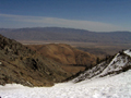 Especially given the elevation gain on the road of some 1,300 feet. Lucky for us, Bahram knew that Sardine Canyon would have snow. So we drove back down the rocky strewn road to the big switch back at 7,500' where the dirt road goes north along about a mile to the bottom of Sardine Canyon. I remember this from a trip with Reiner to Little Onion Valley several years ago. The slopes along the dirt road approach were blackened and scorched from a recent fire. So much so that the ski boots collected a far amount of moon dust. Feeling like astronauts with the tiny town of Independence in the distance we proceed to the narrow notch of Sardine Canyon.
