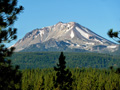 On Fri, 7/5, I hiked at 6 am along an open ridge. There was a sign on the trail from a trail angel family Williams whom I would meet lateron. I descended toward Big Creek Rd and took the Buck Creek alternative route around a lake with restaurants. While walking along the paved road to the lake a car slowed down and the driver called my name. What a surprise. It was the trail angel who heard about me from earlier hikers. He gave me a ride to his home which had nice accomodations for hikers, served a great breakfast and gave me a ride to the shop. This is true kindness by a trail angel. In town I met George again. We had a sumptuous lunch at the Lake Resort and then headed up the road to the PCT crossing at Buck Pass. A 1700' climb got us close to Spanish Mountain. Continuing along the ridge one had the first view of a snow-covered volcano, Mt Lassen. It is an inspiration to start a new mountain range, the Cascades. Now the Sierra Nevada was well behind us. I found a campsite near Clear Creek at mi 1280 which was only 11 mi from Belden.