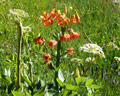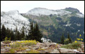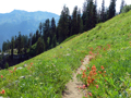 On Sun, 7/14, I headed up toward Deadman Creek, missed one water source and continued with 1.5 l to hike which was a mistake since the trail went up and down without any water sources. Luckily, I ran into a trail maintenance crew who gave me enough water to reach spring WA1460. It is reached by a poorly marked side trail with sparse camping possibilities, but I found a small spot and had 3.5 l of fresh water for cooking dinner and breakfast. It was a 23 mi day with occasionally fine views of Mt Shasta and some pretty wildflower displays.