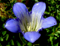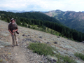 On Wed, 7/24, I was on the trail before the sun was up. In fact, it could not come up since clouds covered the sky. I continued the hike through the Marble Mtns. Little Marbel Meadow was particularly pretty with abundant gentian flowers in green grass all fed by a small spring. The trail continued past Black Marble Mtn to Paradise Lake which looked green due to reflections from the green surroundings. I had a nice lunch break joined by "Slit" and "Double Step". At Buckhorn Spring I refilled my waterbottles, then continued along the high ridge while thunderstorm clouds brewed. The trail then dropped from 6000' to 3000'. The clouds produced no rain. At the end of a 23 mi day I decided to stay near Cliff Creek on an old 4WD road.