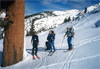 The last act of the day was the ascent of Pear Lake Hut. The snow covered the entire roof. After some sidestepping to the chimney it was a short, fast and steep run down the 45 degree roof. At last, we can say to have skied Pear Lake Hut.