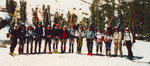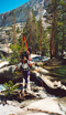 On Monday, Memorial Day, we got up leisurely at 7 am, ate breakfast and packed in the sunshine, and hiked/skied out by 9:30 am. Skiing down with full packs through trees and bushes is another backcountry experience which a lift ticket cannot provide. The fun ended near Donkey Lke where we rediscovered the trail and marched out like normal hikers. At Blue Lke we regrouped for lunch, and at the South Fork of Bishop Creek we had another interesting stream crossing. It's interesting to see the variety of approaches in a big group: Some did a ballerina dance on tele boots over slippery logs, others walked barefoot through the icy water, some did not care and plowed through the gushing creek with full gear, but luckily nobody fell in. By 1:30 pm we were all back at the cars, signed out and ready to hit the Muleday traffic. It seems that everyone was satisfied with the successful peak climbing and skiing in beautiful weather and mountains. The leaders were especially pleased that the large group had no accidents/incidents. Shows that we had a wonderful group of fine ski mountaineers. Thanks, Mark, for helping to lead such an enjoyable outing. And thanks to Craig for the stats of the trip from his map program: 18.2 mi, 7,430', rt. Reiner Stenzel