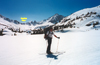 From there we skinned up on the trail which parallels the creek. Except for some creek crossings we had solid snow coverage. Between Buzztail and Horsetail Springs the trail turns southward and a great panorama of snow covered peaks of the backcountry opens up. We navigated through forest, crossed frozen lakes, climbed some steep gullies, which by 3 pm got us to the McGee Lks. We camped on a plateau at 11,200' between Big and Little McGee Lks with great views on Red and White, Crocker, Hopkins, corniced Hopkins Pass, and several frozen lakes. We relaxed in the afternoon sun before it vanished in approaching high clouds. We planned our ascent route via Pk 12,360' and the cl 3 NE ridge, although the difficulty of the latter was not obvious. By dinner time the sky was grey, low clouds were drifting in and the prospect for the peak climb became uncertain.