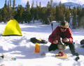 At the trailhead, another Sierra Club group of about 15 people was heading in with sleds, snowshoes, steaks and wine to camp at Mills Lake and attempt a climb of Mt. Abbot - which was still quite snow-covered for this time of year. Even with skins and heavy packs we were able to pass the snowshoers with the little glide our skins gave us, and within two and a half hours we were setting up camp and looking for water sources. At some open water, we observed a rare breed of Sierra Snow Trout. We decided to take advantage of the early arrival and go skiing instead of setting up a snow kitchen at 11AM.
