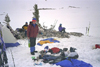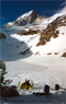 Alvin and Reed were safely back at dinner time and said that John should be just an hour behind. As the weather let up we enjoyed our dinners. The most decadent one included fresh trout, fried potatoes with onions, a bottle of Chardonnay, and frozen ice cream. The mood was great but something was wrong, John was still not back. By nightfall, we knew that John must have had an accident. On their private outing, Alvin had soloed Bear Creek Spire (13,720') and described it as a challenging class 4 climb. Reed wisely turned back just below the summit, and on their way down both met John who looked tired and slow. Worst of all, John had left his pack at the skis in the snow below the ridge to make a quick, light ascent. He was improperly dressed in a cotton flannel shirt and had no ice axe or 10 essentials. They tried to talk him out of the climb pointing out the approaching storm but John brushed the advice aside and pushed forward. By nightfall we knew that we had to initiate a search and rescue action. Since only Alvin and Reed knew John's route they volunteered to look for him. They left by 9 pm with emergency supplies retracing their earlier route by flashlight. With my Motorola radios Alvin and I stayed in constant radio contact for their own safety and in case they would need a backup for a rescue. They found his skis and pack untouched which meant he had an accident on the ridge. They followed in darkness and snow storm to about 200' below the summit calling his name and searching in vain. The search had to be called off and Alvin and Reed returned by midnight completely exhausted. They gave John little chance to survive the stormy night at 13,700' without proper protection and possible injuries. We decided to contact the sheriff first thing in the morning to ask for a professional Search and Rescue Team. Everyone was deeply disturbed about the likely possibility of a fatality and had an awful night. |