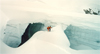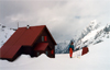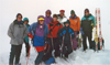 April 8 (by Larry Bigler): The day began as they often do with everyone getting up in turn from 0100 on, to find a head lamp, stagger down the stairs, put on the rubber boots, and go to the outhouse. At least we did not have to climb down to the outhouse like two years ago, (This is Larry's third Selkirk trip!) It would be better, I think, to set an alarm for 0100 and all go out at once, rather than spread the noise out over an hour. Accusations of snoring are indigenous to hut sleeping arrangements. My ear plugs worked well, Diann turned down my unused spare pair; she was afraid she wouldn't be able to get them out of her ears. We got up around 0600 to blowing snow and limited visibility. We lingered over coffee, tea, Ruedi's bread, oatmeal, and Martin's scones before setting off for Mt. Graham (9880') at 0900. The wind was blowing 20-30 mph with occasional stronger gusts accompanied by snow and limited visibility. With skins, we climbed and traversed, traversed and climbed. The snow seemed a bit crusty in spots, creating my usual concern about the downhill. We took a quick break in a notch on Mt. Graham. With skis on shoulders, we climbed up 10 steps and over onto the shoulder of Graham. We zig-zagged to the shelter of a large rock near the summit where two waited while the rest collected the peak; it's on the Selkirk list. After two traverses, the ski down was comfortable with mostly good snow moderated by limited visibility. We returned to the hut at 1230. While the wind and snow continued, we passed the rest of the afternoon enjoying companions, games of hearts, and National Geographics. April 9 (by Howard Schultz): Mt, Moloch Hut, 0500: My alarm beeps only minutes after I fall asleep after a fitful night trying to sleep through the wind shaking the building, a four-person chorus attempting to snore the Anvil Chorus, sore muscles and aching joints, and someone punctuating the chorus with loud farts. Don rolls over and proclaims in Army drill sergeant style, "It's five o'clock! You will rise! You will shine!" bringing laughter from the next room and groans from our room. Finally, I get up and close the window, and others start grousing around. Martin and Richard have coffee ready, so I slowly get up, carefully stretching and straightening the sore, abused muscles and joints. My next movement is for the Advil. I nod grumpily at the others and lunge for the coffee. After breakfast of coffee, tea, scones, and jam, we load our packs, sweep out the hut, and step out into a 15-20 mph breeze driving fresh snow into our faces and down our necks. It feels good to get on the skis and work out the stiffness. We ski around the bowl and stop below Fang Col while Martin skis ahead of us and checks the slope for stability. We maintain a 30-meter spacing up the slope so an avalanche won't wipe all of us out. At times, we get a glimpse through the clouds of some of the magnificent views available in good weather. After ascending the Fang Glacier, we reach the Diamond Plateau and ski across it in a complete white out. Martin carefully snowplows a zig- zag course through the Diamond Icefall; and we follow, thighs and ankles on fire from the effort. Every couple of turns, we see a crevasse on one side of us or the other. Martin is really impressive; unerring, without hesitation, and with supreme confidence, he guides us through the icefall in zero visibility, I understand why Ruedi says Martin is "the best guide I have worked with." After a long traverse, I begin to recognize some of the features we skied by days before. We ski down through the Needle Icefall, and the snow becomes like heavy, wet cement, sticky and difficult to ski. Most of us are very tired, and this snow is taking a heavy toll on us. Finally, we reach the foot of the icefall and the trail leading back up to the chalet.