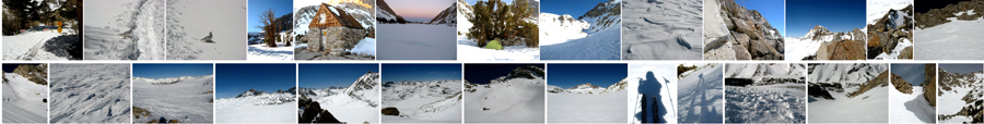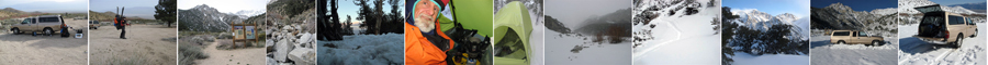 Mt Emerson loomed next to me and I decided to move my camp a short distance to Lock Leven Lake where I thought I had another good shot at the peak the next day. The snowfield I started out on had a large amount of avalanch debris from the blizzard several days earlier and I climbed right past it to a point where I reached a steep hard icy chute. I didn't feel comfortable going up it with only one ice axe and no ice screws and again had to retreat without getting near the top. Back at camp, it was still early enough to have a hot lunch break, pack all my gear, and ski all the way back down to my truck in excellent snow conditions. From there I decided to head down to Big Pine and drive up the road to the Glacier Lodge where I could make a day trip attempt on Mt Alice on Sunday. The wind was ripping and rocked me to sleep in my truck where I was parked at the trailhead. The wind had lightened up a bit in the morning and I was looking forward to skiing with a light day pack up the main chute on the south side of Mt Alice. Once in the chute, it made much more sense to just put my crampons on and go straight up rather than attempting switchbacks on hard snow. The initial steeper chute led to another longer, broader, and mellower chute that led to another long, broad, and slightly steeper chute that led to the Mt. Alice ridgeline where I left my skis to climb for about 40 minutes on the 3rd class rock and snow in some very strong winds to the top of Mt Alice. It felt good to make this one fine peak, but I had to get moving down to avoid getting too chilled. At my skis, the ridgeline snow was frozen hard and I cautiously entered the top of the highest chute then executed what seemed like hundreds of turns down the three levels of chutes while filming with my Flip Video that was mounted on my helmet. Conditions were very wintery all day and I had the mountains all to myself for a fine culmanation of an adventurous week of skiing. Footnotes: 1. I'll try to send a video of how things looked inside my tent as the snow rapidly accumulated outside. 2. Ellen and I just read, this last weekend, about an experience that Norman Clyde and a friend had at Piute pass where a blizzard like the one I experienced caught them. Norman's friend froze to death and Norman got a serious case of frostbitten toes -- so, I don't think I made the wrong decision when I retreated. Those mountains and passes will still be there long after me and I will still have a chance to try them another day. |